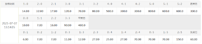 竞彩官方同时开出了比分赔率,其中切尔西1-0取胜最低,目前为1赔6,而2-0、2-1、1-1的赔率均为1赔7,虽然总体倾向切尔西,但平局打出的概率不低,数据对于蓝军面对巴西球队时的表现有所顾忌。进球方面,双方合力贡献2球1赔3.35最低,其次是3球的1赔3.8,总体倾向进球不多,弗鲁米嫩塞有希望在常规时间拖住蓝军。