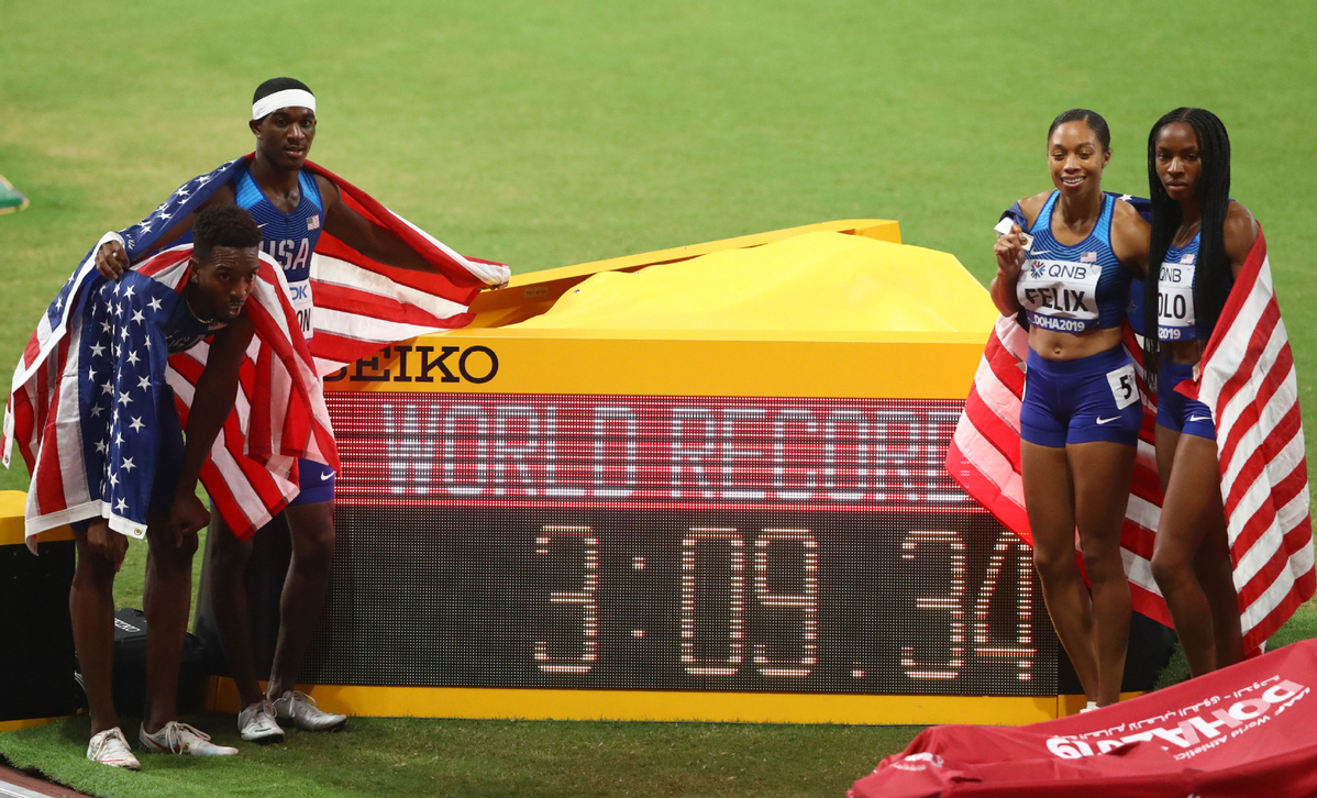 美国队在2019年9月29日于多哈举行的世界田径锦标赛上庆祝夺冠并打破混合4x400米接力决赛的世界纪录。[照片/代理商] 这是首次进入世界锦标赛的混合接力赛,美国在三分钟内创下了9.34秒的世界纪录,在周六的预赛中以3:12.42打破了自己的世界纪录。   牙买加在3:11.78的国家纪录中排名第二,而巴林则在3:11.82的地区纪录中夺得铜牌。   牙买加的蒂芬妮·詹姆斯说:“这次活动很有趣,非常令人兴奋。看台上的人们一定很高兴看到男人与女人抗争。”   牙买加的32届奥运会双冠王雪莉·安·弗雷泽-普莱斯(Shelly-Ann Fraser-Pryce)重返世锦赛,重新获得了100m的桂冠。   曾七次获得世界冠军的弗雷泽-普莱斯(Fraser-Pryce)在那年8月生下一名男婴时错过了2017年伦敦世界大赛,但在世界领先的10.71时重返多哈。英国人蒂娜(Dina Asher-Smith)在10.83中排名第二,科特迪瓦的玛丽-乔西(Marie-Josee Ta Lou)在10.90中排名第三。   弗雷泽说:“站在32岁时抱着婴儿再次回到这里,是一个梦想成真。昨晚我没睡过。上一次我参加大满贯赛是2016年,我睡不着觉。”普赖斯。   欧洲室内冠军安佐利卡·西多罗娃(Anzhelika Sidorova)是获准作为中立运动员参加比赛的俄罗斯运动员,在比赛中获得了4.95米的距离,从而获得了女子撑杆跳比赛的金牌。   西多罗娃(Sidorova)和美国奥运银牌得主桑迪·莫里斯(Sandi Morris)在最后一次尝试将其清除时,将其推高到4.90高度。希腊的奥运冠军卡特琳娜·斯特凡尼迪(Katerina Stefanidi)以4.80分获得铜牌。   这位28岁的年轻人说:“我在世锦赛上的所有表现都不太成功。我当然希望停止这种不良传统。”“我哭是因为我真的很开心。”   两次获得奥运会冠军的美国基督徒泰勒在17.92米的三级跳远中赢得了他的第四个世界冠军。他的同胞威尔·克莱(Will Claye)在17.74赢得了银牌,布基纳法索的Hugues Fabrice Zango在17.66获得了第三。